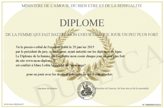 Envoyez par email votre Diplôme de la femme qui fait battre mon coeur chaque jour un peu plus fort personalisé