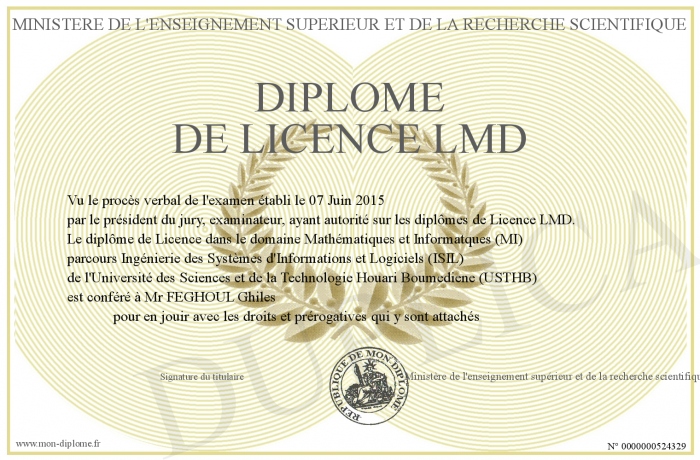 Envoyez par email votre Diplôme de Licence LMD personalisé