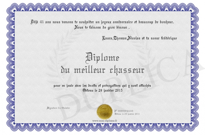 Envoyez par email votre Diplôme du meilleur chasseur personalisé