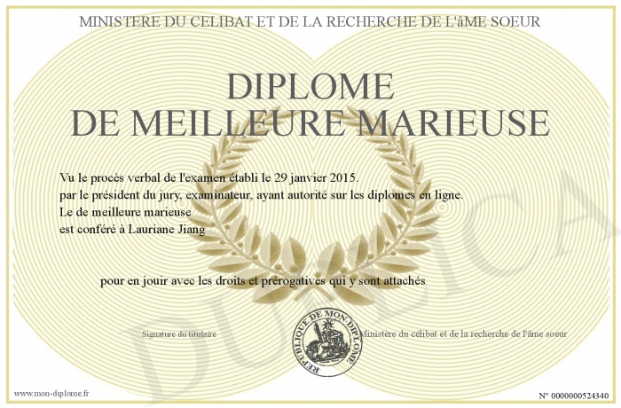 Envoyez par email votre Diplôme de meilleure marieuse personalisé