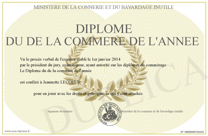Envoyez par email votre Diplôme du de la commère de l'année personalisé