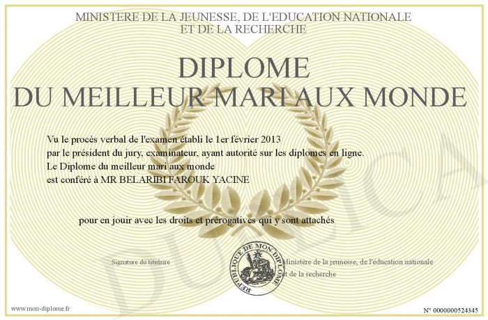 Envoyez par email votre Diplôme du meilleur mari aux monde personalisé