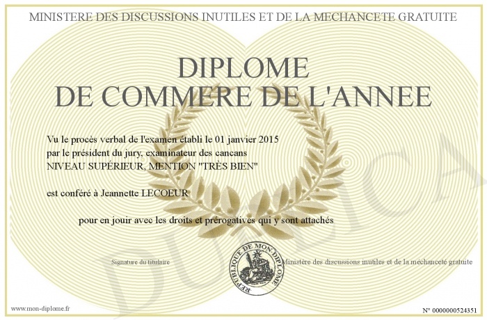 Envoyez par email votre Diplôme de commère de l'année personalisé
