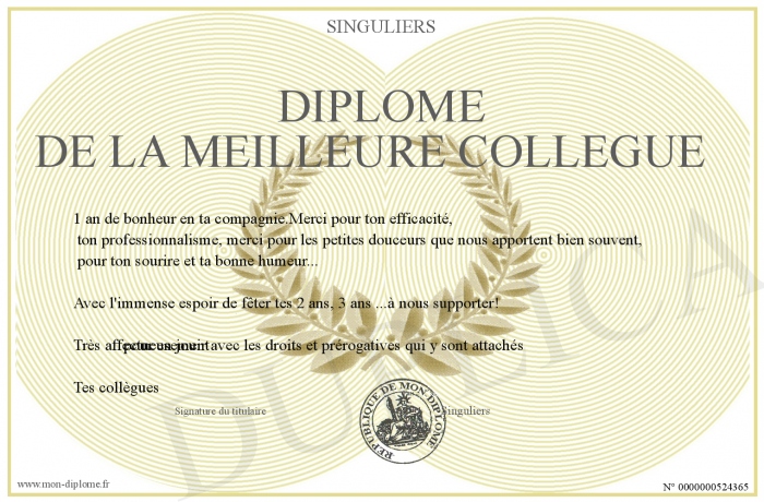 Envoyez par email votre Diplôme de la meilleure collègue personalisé