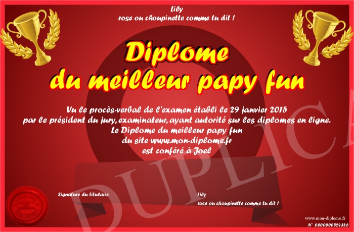 Envoyez par email votre Diplôme du meilleur papy fun personalisé