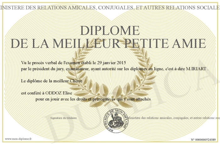 Envoyez par email votre Diplôme de la meilleur petite amie personalisé