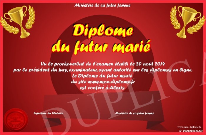 Envoyez par email votre Diplôme du futur marié personalisé