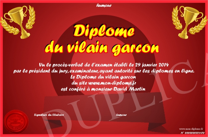 Envoyez par email votre Diplôme du vilain garcon personalisé