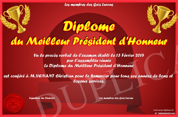 Envoyez par email votre Diplôme du Meilleur Président d'Honneur personalisé