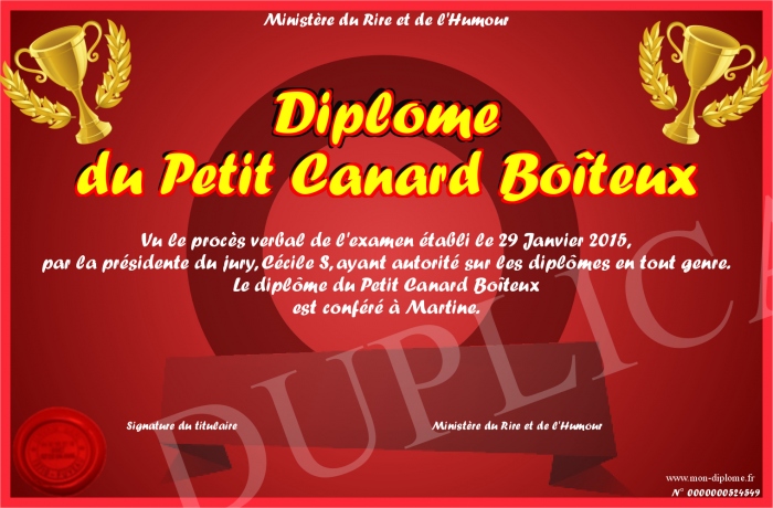 Envoyez par email votre Diplôme du Petit Canard Boîteux personalisé