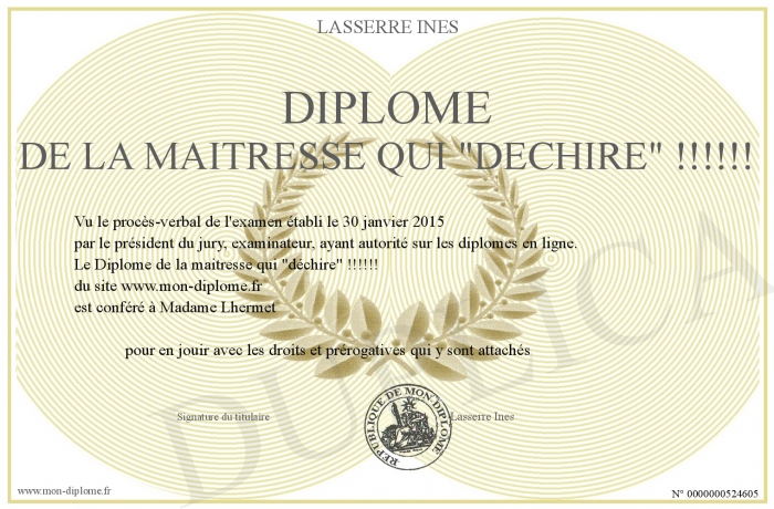 Envoyez par email votre Diplôme de la maitresse qui -déchire- !!!!!! personalisé