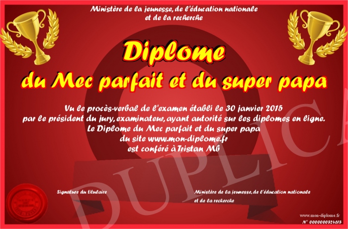 Envoyez par email votre Diplôme du Mec parfait et du super papa personalisé