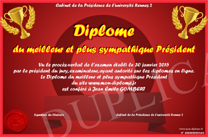 Envoyez par email votre Diplôme du meilleur et plus sympathique Président personalisé