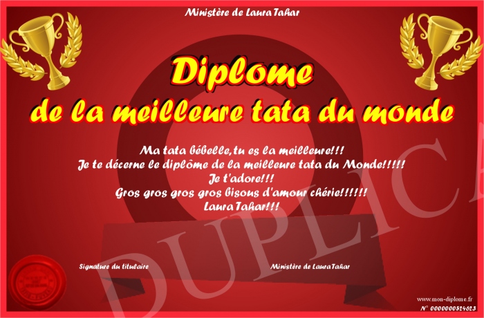 Envoyez par email votre Diplôme de la meilleure tata du monde personalisé