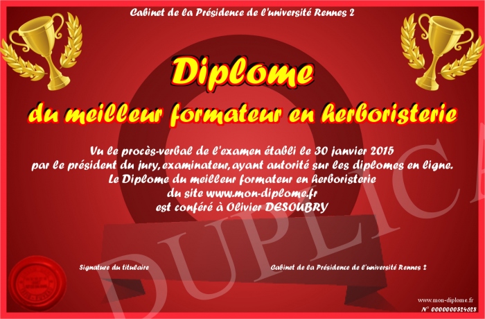 Envoyez par email votre Diplôme du meilleur formateur en herboristerie personalisé