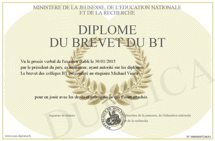 Envoyez par email votre Diplôme du brevet du BT personalisé