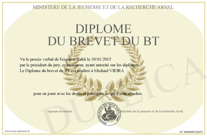 Envoyez par email votre Diplôme du brevet du BT personalisé