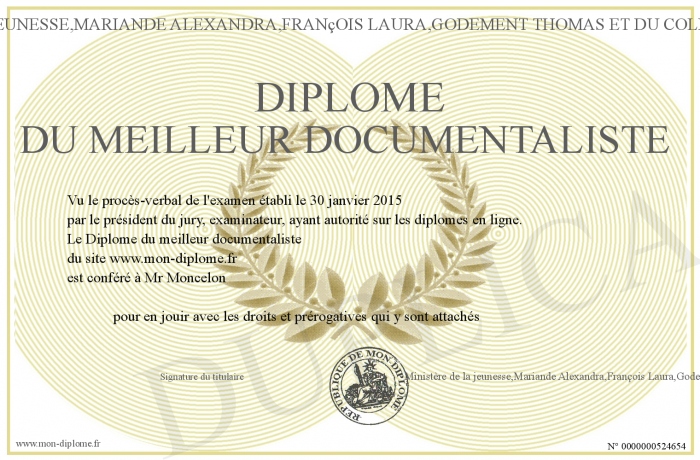 Envoyez par email votre Diplome du meilleur documentaliste personalisé