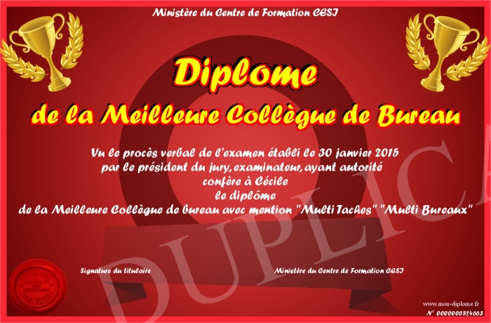Envoyez par email votre Diplôme de la Meilleure Collègue de Bureau personalisé