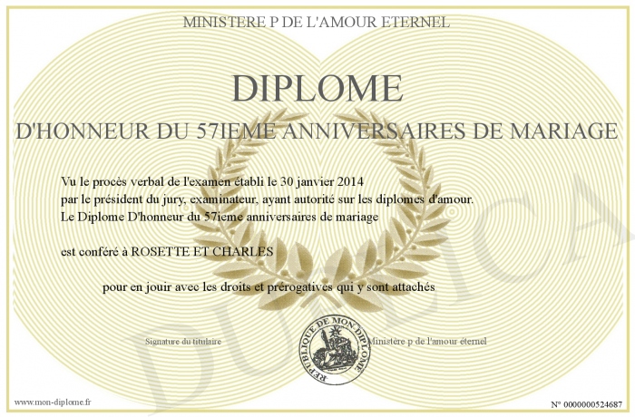Envoyez par email votre Diplôme D'honneur du 57ieme anniversaires de mariage personalisé