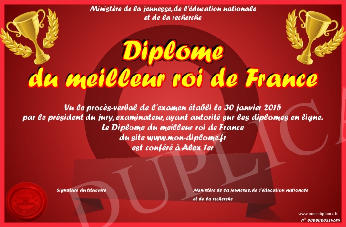 Envoyez par email votre Diplôme du meilleur roi de France personalisé