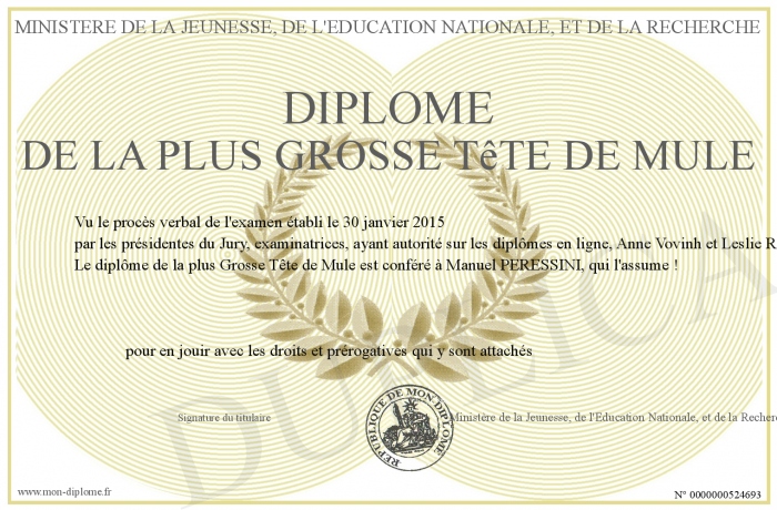 Envoyez par email votre Diplôme de la Plus Grosse Tête de Mule personalisé