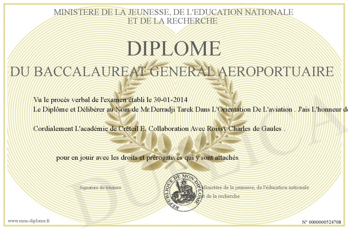Envoyez par email votre Diplôme du baccalaureat général Aéroportuaire personalisé