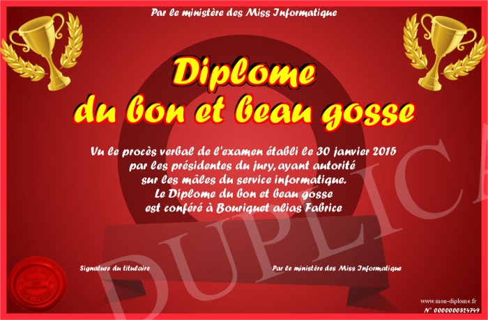 Envoyez par email votre Diplôme du bon et beau gosse personalisé
