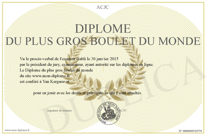 Envoyez par email votre Diplôme du plus gros boulet du monde personalisé