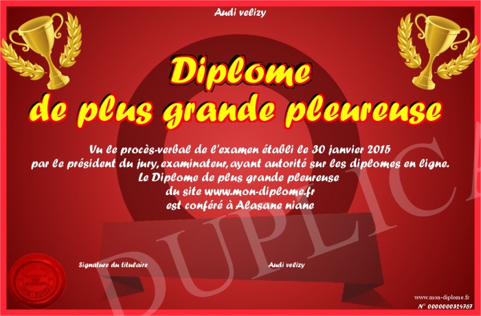 Envoyez par email votre Diplôme de plus grande pleureuse personalisé