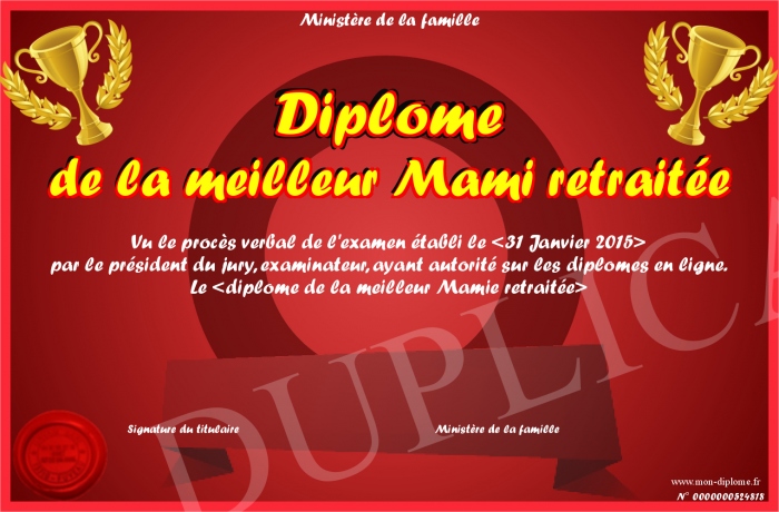 Envoyez par email votre Diplôme de la meilleur Mami retraitée personalisé