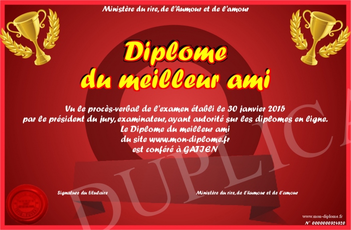 Envoyez par email votre Diplome du meilleur ami personalisé