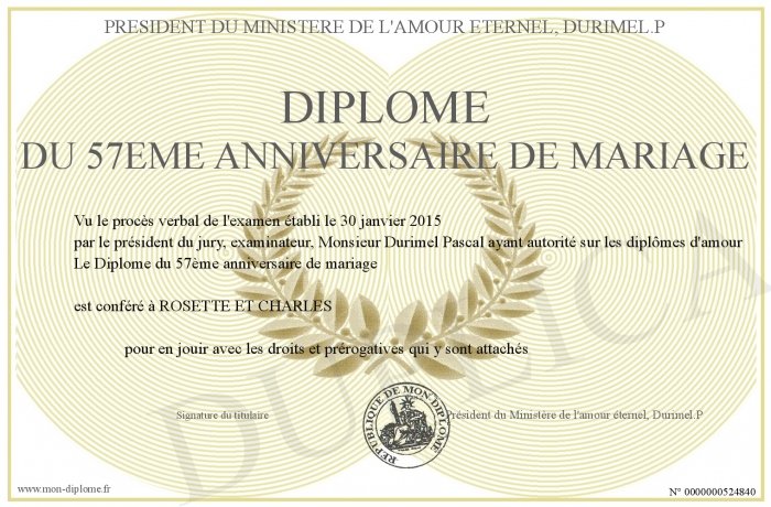 Envoyez par email votre Diplôme du 57ème anniversaire de mariage personalisé