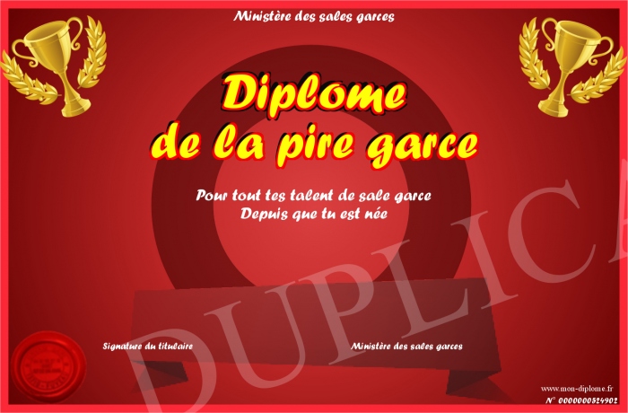 Envoyez par email votre Diplôme de la pire garce personalisé