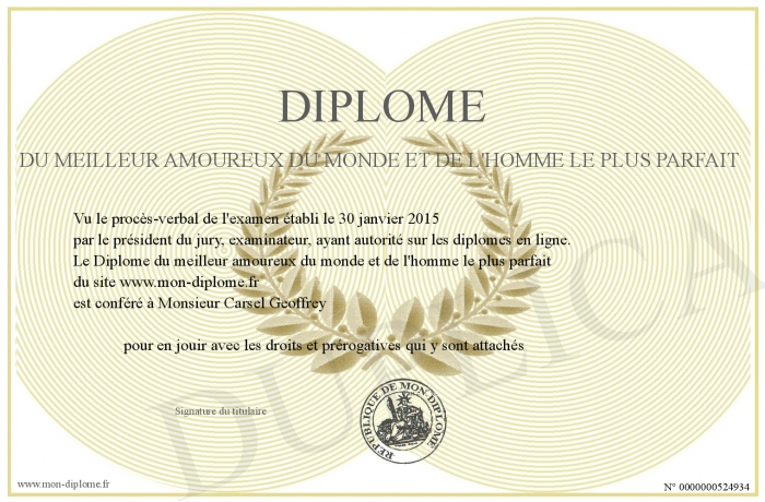 Envoyez par email votre Diplôme du meilleur amoureux du monde et de l'homme le plus parfait personalisé