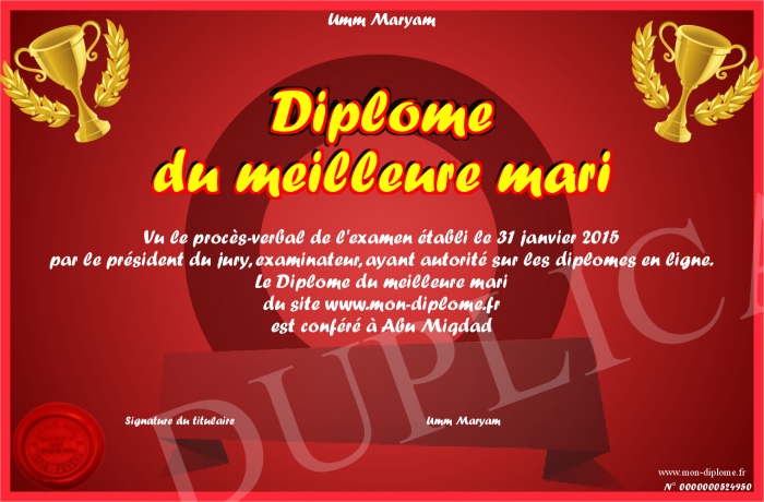 Envoyez par email votre Diplôme du meilleure mari personalisé