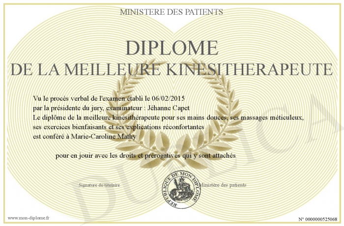 Envoyez par email votre Diplôme de la meilleure Kinésithérapeute personalisé