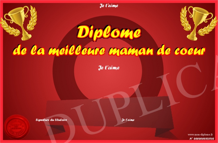 Envoyez par email votre Diplôme de la meilleure maman de coeur personalisé