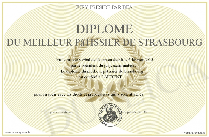 Envoyez par email votre Diplôme du meilleur pâtissier de Strasbourg personalisé