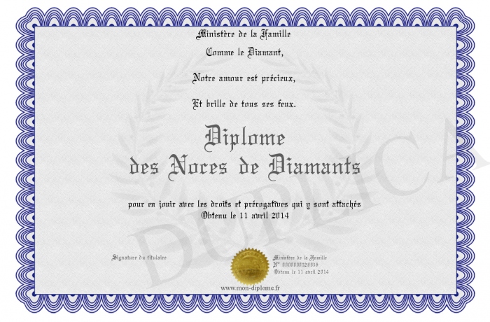 Envoyez par email votre Diplôme des Noces de Diamants personalisé