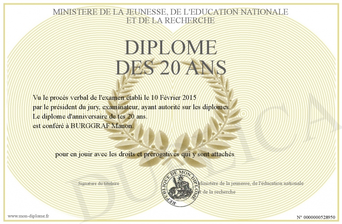 Envoyez par email votre Diplôme des 20 ans personalisé