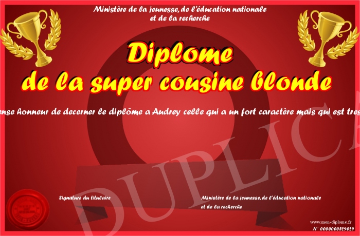 Envoyez par email votre Diplôme de la super cousine blonde personalisé