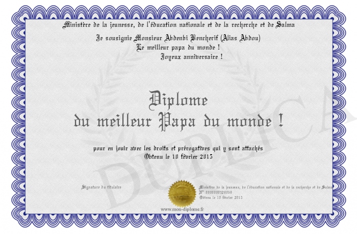 Envoyez par email votre Diplôme du meilleur Papa du monde ! personalisé