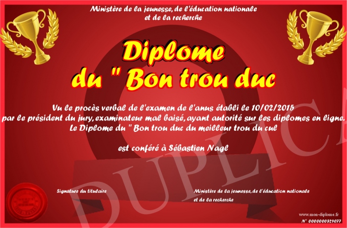 Envoyez par email votre Diplôme du - Bon trou duc personalisé