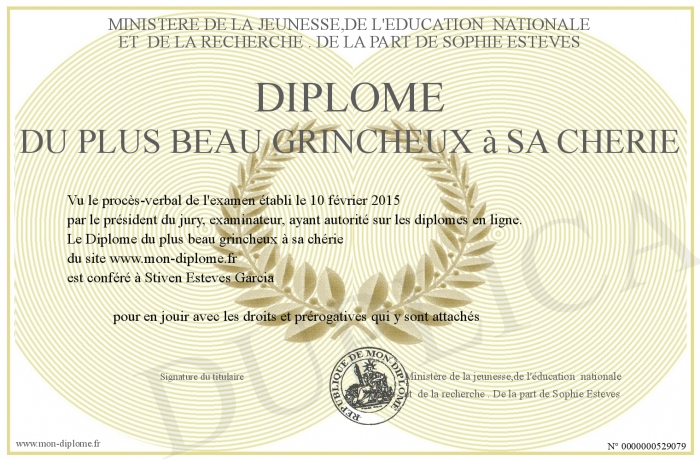 Envoyez par email votre Diplôme du plus beau grincheux à sa chérie personalisé