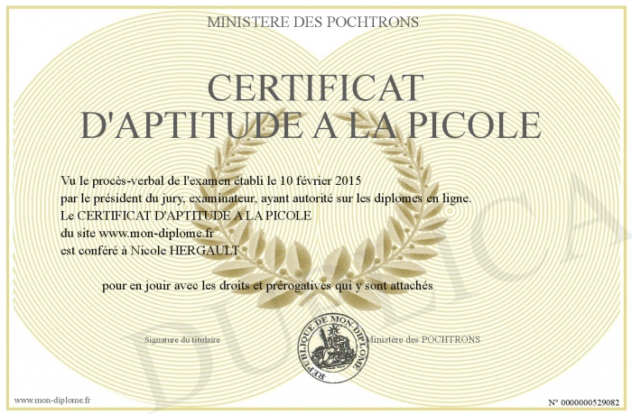 Envoyez par email votre CERTIFICAT D'APTITUDE A LA PICOLE personalisé