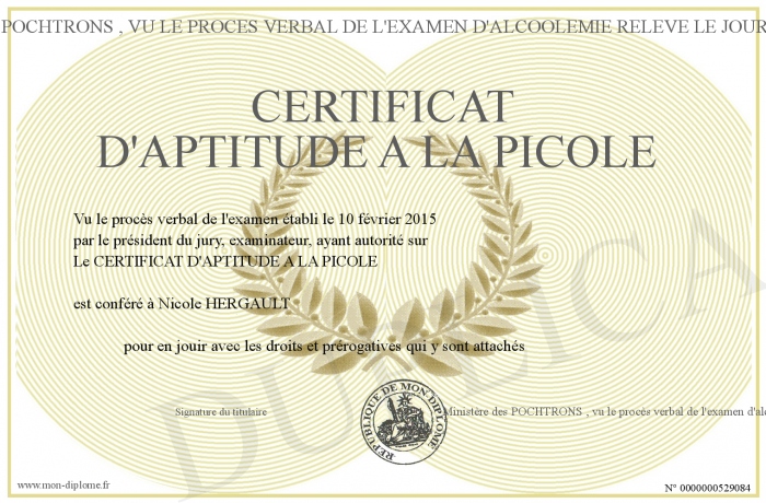 Envoyez par email votre CERTIFICAT D'APTITUDE A LA PICOLE personalisé
