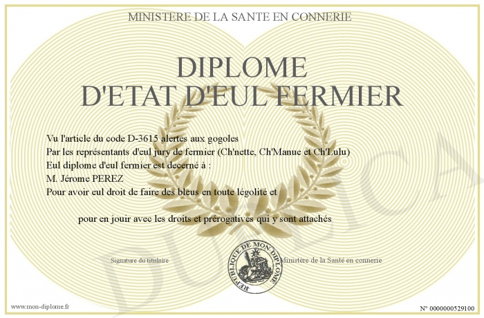 Envoyez par email votre Diplôme d'ETAT D'EUL FERMIER personalisé