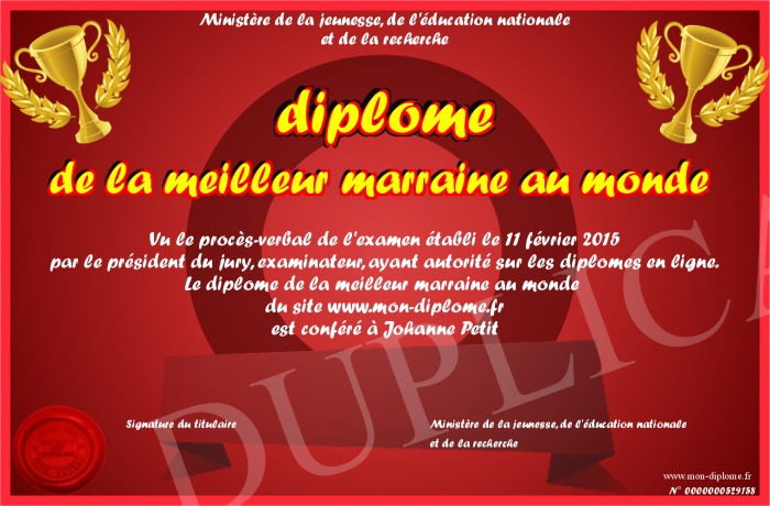 Envoyez par email votre diplome de la meilleur marraine au monde personalisé