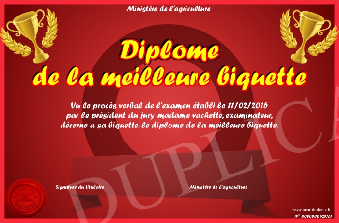 Envoyez par email votre Diplome de la meilleure biquette personalisé